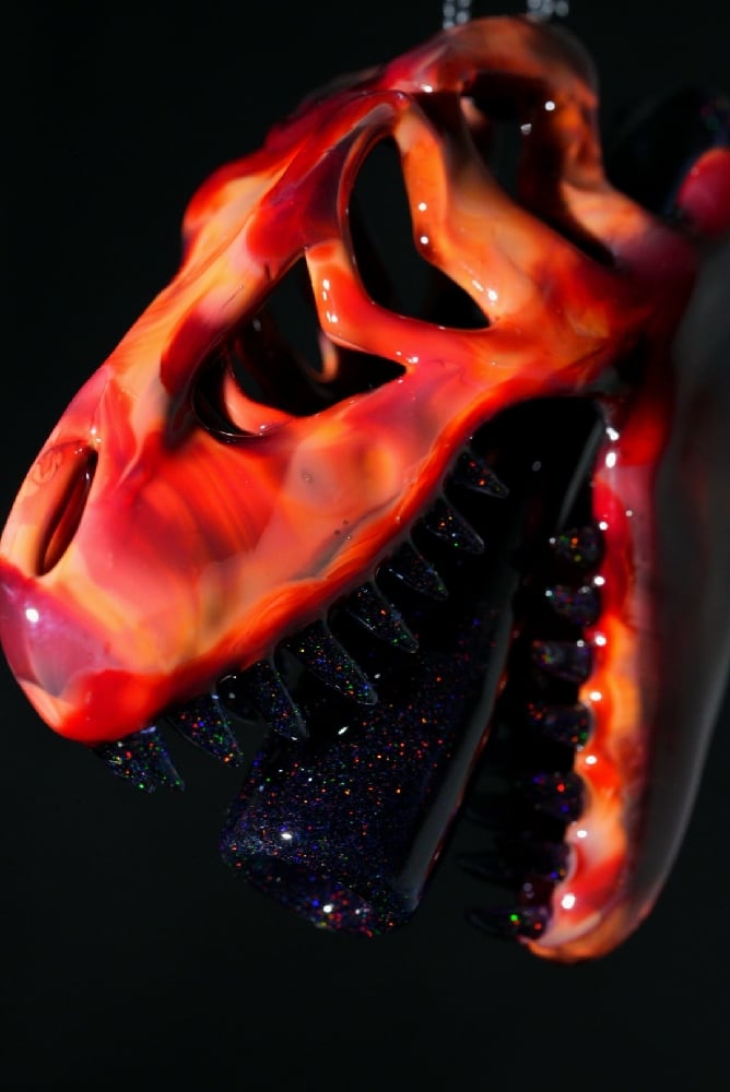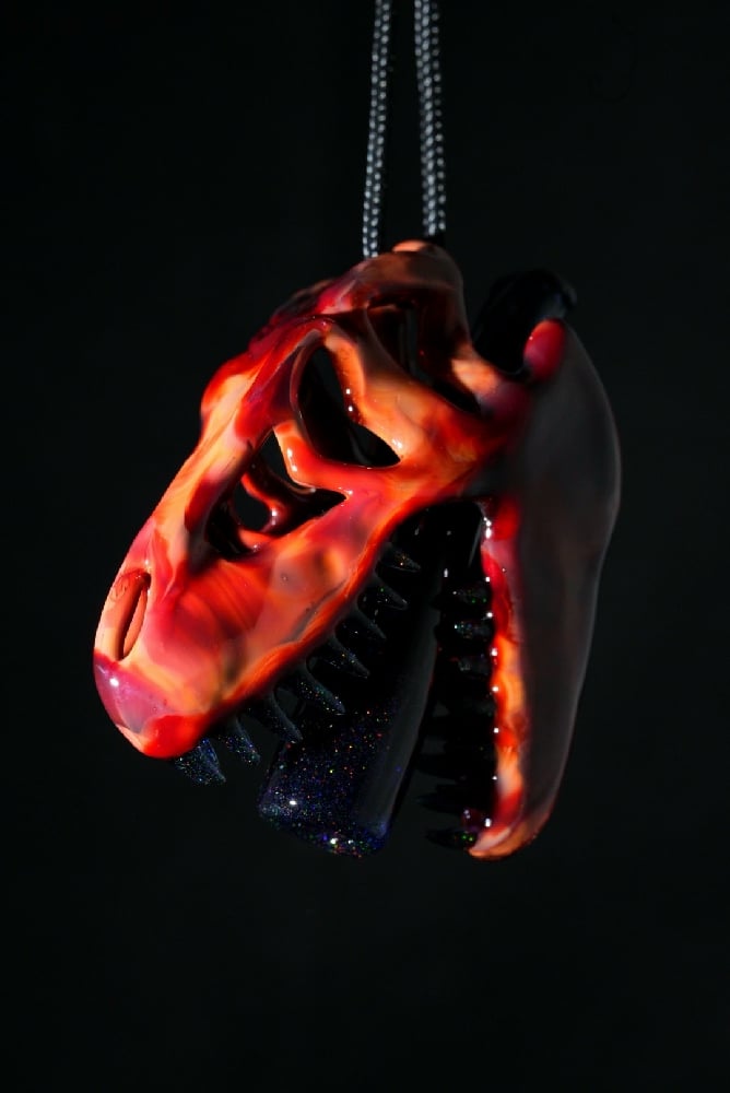 Dark Ruby T-Rex skull pendant with crushed opal teeth & J-holder.