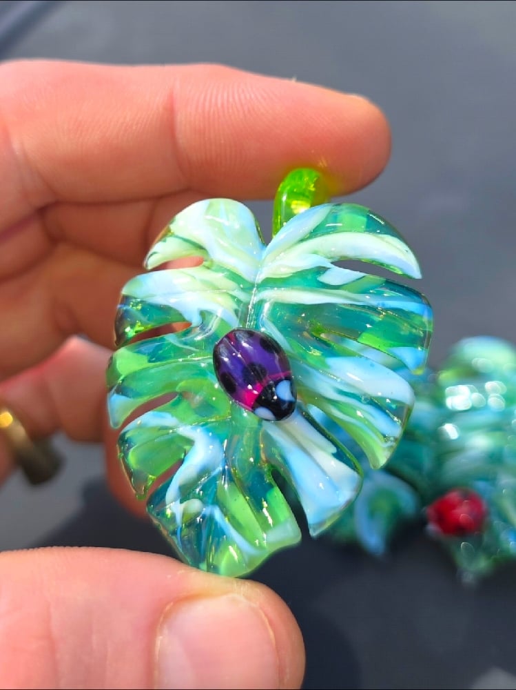 Uv reactive Variegated monstera leaf pendant with purple ladybug